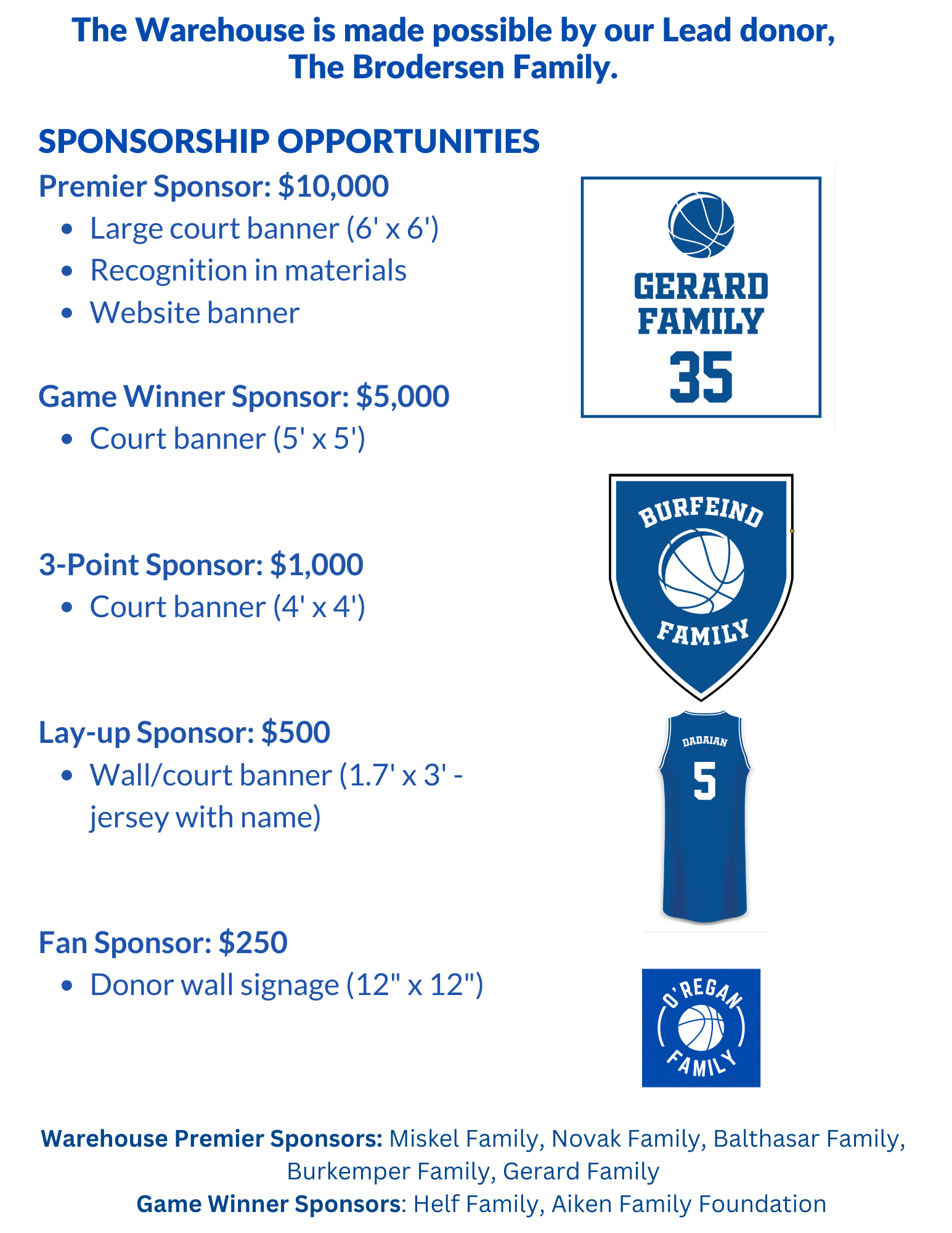 Thank You to our Warehouse Premier Sponsors: The Miskel Family, The Novak Family, The Balthasar Family, The Burkemper Family, and The Gerard Family